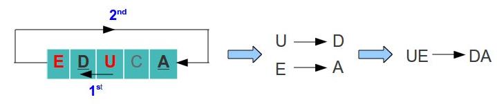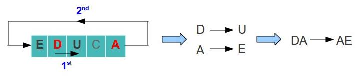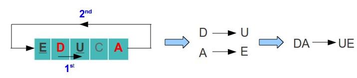 - In case two letters are in the same row, replace each letter with the letter to the left. In case the letter is at the last column, pick the letter of the first row (the table is considerate to be circular). For example, lets say we have the letters U and E: