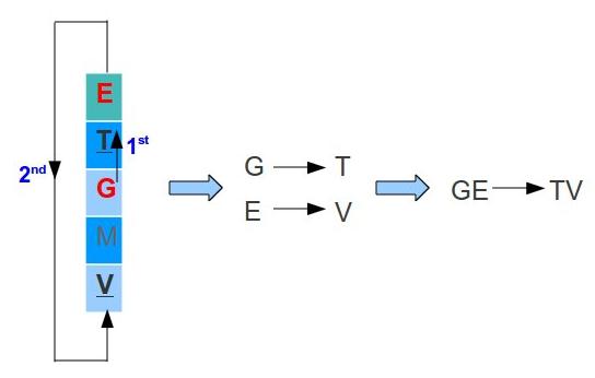 - In case two letters are in the same column, replace each letter with the letter above. In case the letter is at the last row, pick the letter of the first row (the table is considerate to be circular). For example, lets say we have the letters G and E: