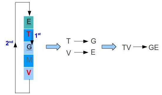 - In case two letters are in the same column, replace each letter with the letter below. In case the letter is at the last row, pick the letter of the first row (the table is considerate to be circular). For example, lets say we have the letters T and V: