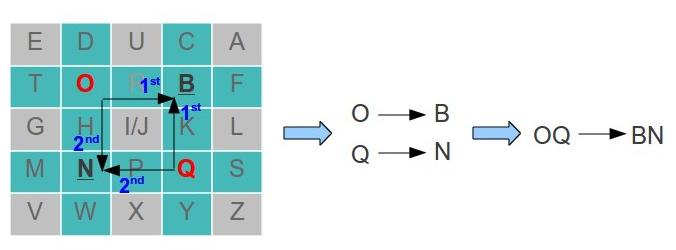 - In case two letter are in different row and column, the first letter will be replaced with another letter of the same row on the column of the second letter. The second letter will be replaced with another letter of the same row on the column of the first letter. For example lets say we have the letters B and N: